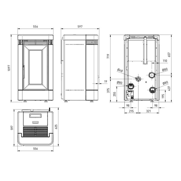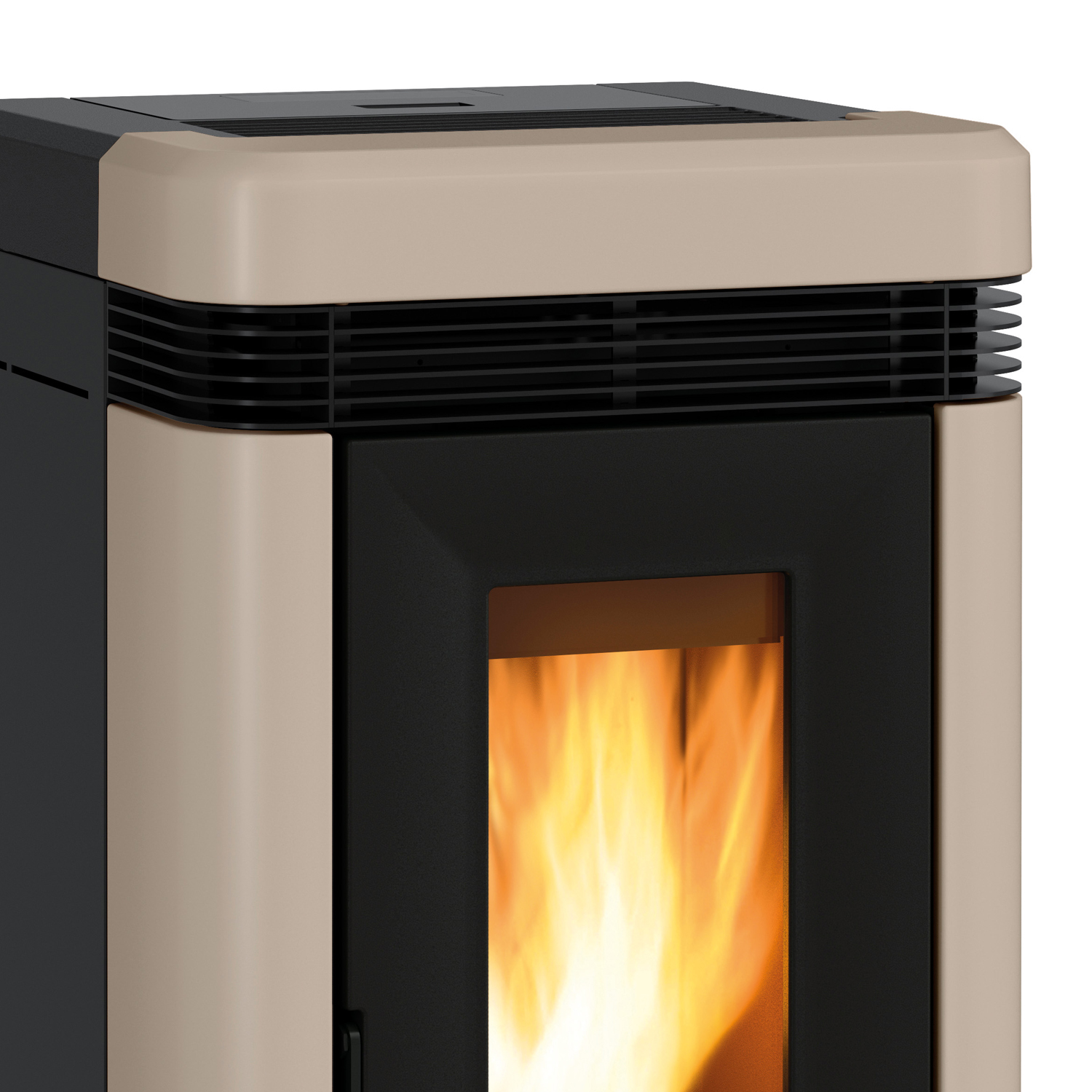 Die Seitenverkleidungen bestehen aus Majolika-Keramik. Dank vieler nützlicher Funktionen heizen Sie Ihrem Wohnraum ein. Neben dem programmierbaren Thermostat, mit Hilfe dessen Sie bis zu vier Einstellzeiten speichern können, verfügt der Pelletofen auch über die Acoustic Comfort Funktion, womit er den Raumlüfter regelt und geräuschreduziert arbeitet. Außerdem sorgt er mit der Auto Re-Start Funktion für einen sicheren Neustart nach einem Stromausfall.
