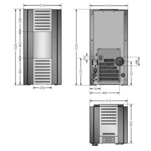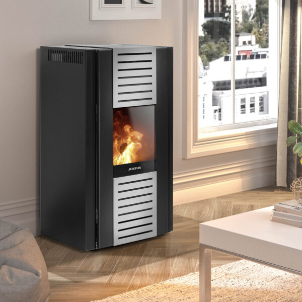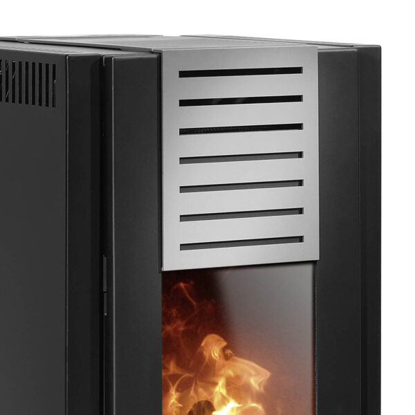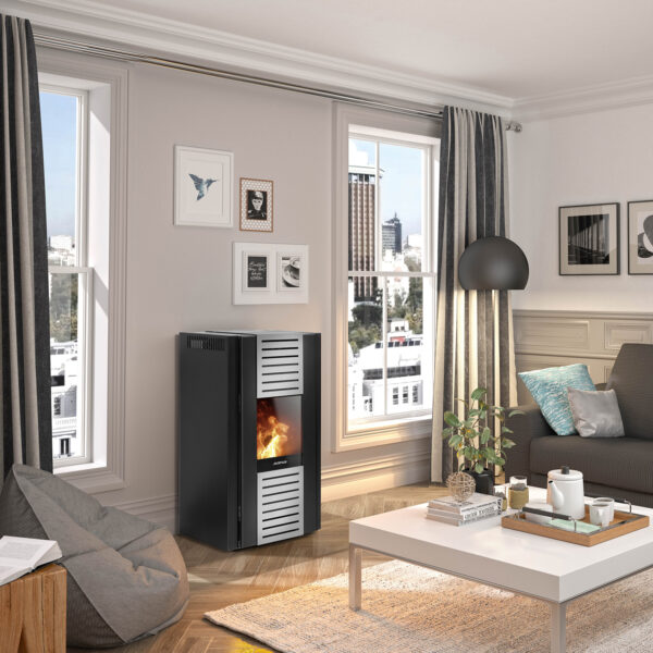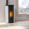 Der viereckige Pelletkamin besteht aus einem Korpus und einer Seitenverkleidung aus Stahl mit den Farboptionen Schwarz, Bordeauxrot, Taupe und Seidenweiß. Über das Varianten-Menü können Sie sich für Ihr Lieblingsdesign entscheiden.